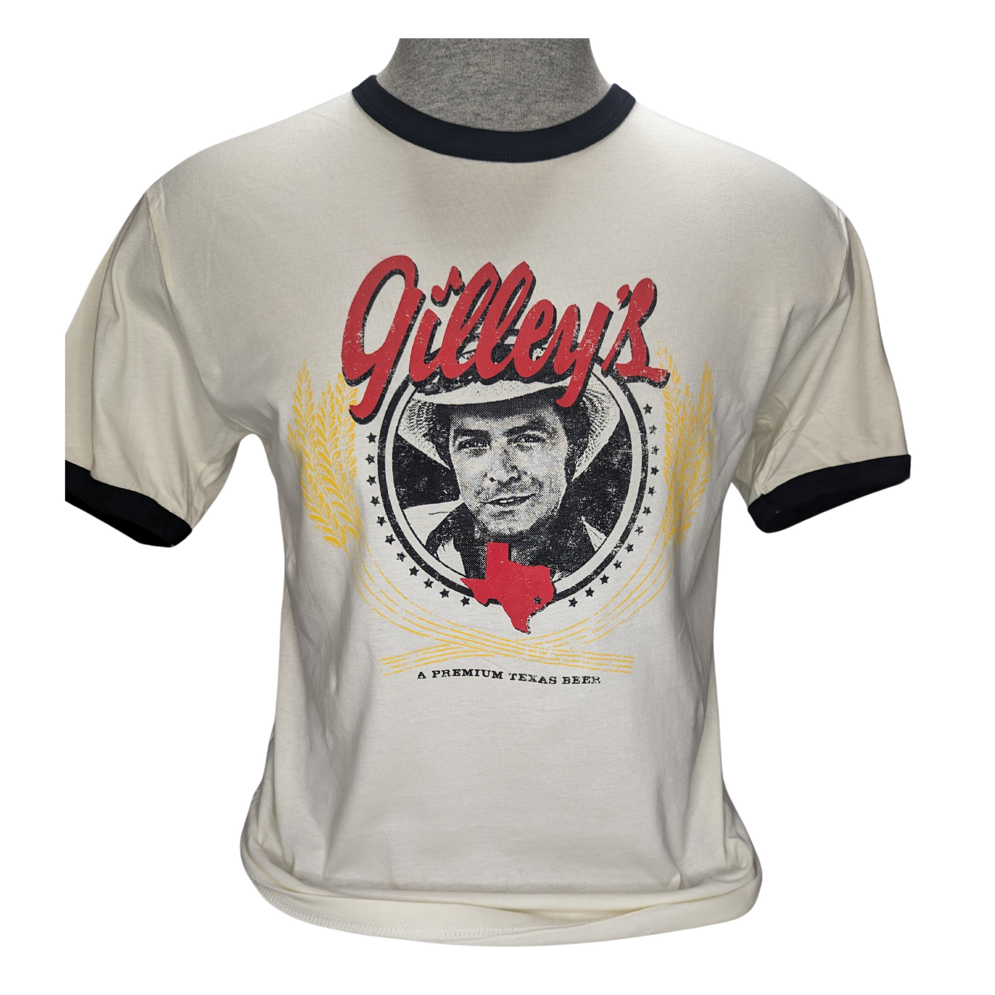 Inspired by the vintage beer cans from the 1980s, our Gilley’s Premium Texas Beer Ringer Tee features a classic image of Mickey Gilley—reminiscent of the original Gilley’s beer label—now revived on our new Texas craft blonde ale.
