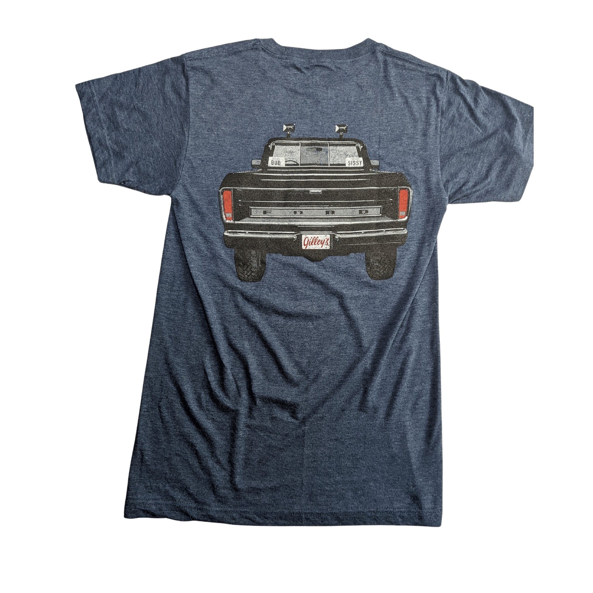 The back of this shirt showcases an image of Bud’s truck, complete with the famous license plates hanging in the rear window—"Bud" and "Sissy".